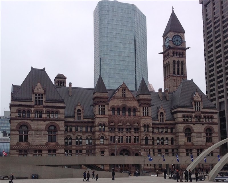 I always joke with my kids and my wife that I am from Canada. I don't know why--ever since I was a little kid I have had a weird affinity for Canadians. I cheer for their hockey teams, I like the sight of the Maple Leaf, and I like the accent. I suppose some of it was my love for winter. I skied, played hockey and just generally enjoyed the cold. That has certainly changed, but I still do like Canada--despite the cold. Last night I arrived in Toronto for the International Studies Association conference--first time here, so I was excited to see the city. Unfortunately, I was also sick and getting sicker so my time spent out and about in Toronto was limited. But in my walk back to the hotel today I passed the old City Hall building. I thought it was a classic building and the perfect pic of the day. So wave the Maple Leaf, drink a Keith's beer and sing Oh Canada in tribute to our northern neighbors.
